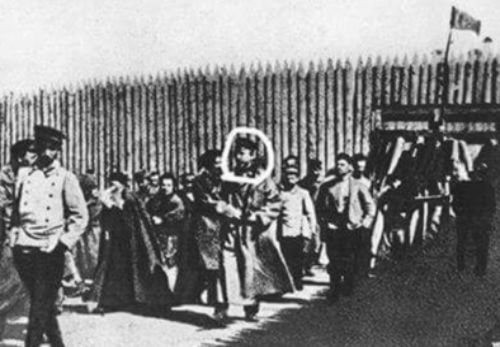 Фотографии Александровской тюрьмы и группы повстанцев, в том числе Феликса Дзержинского. Принято считать, что он на картинках - отмечен на булавке, но трудно в этом признаться. Между тем, он на среднем фото — фигура в черном и шляпе наверху.